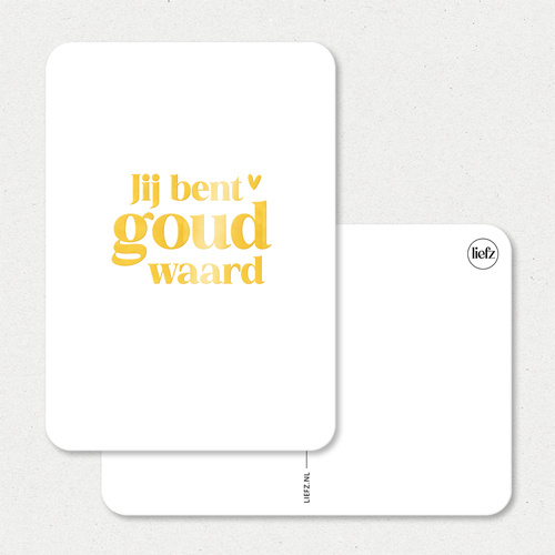 Jij bent goud in goudfolie letters waard! De leukste manier om iemand te bedanken of te laten weten dat iemand heel belangrijk voor je is. Lief om op te sturen of om bij een cadeautje of bos bloemen te geven.