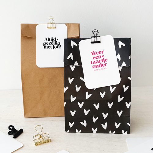 De ronde hoeken en de roze letters geven het kaartje een extra vrolijke uitstraling.